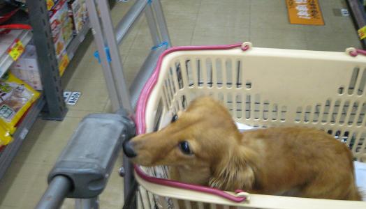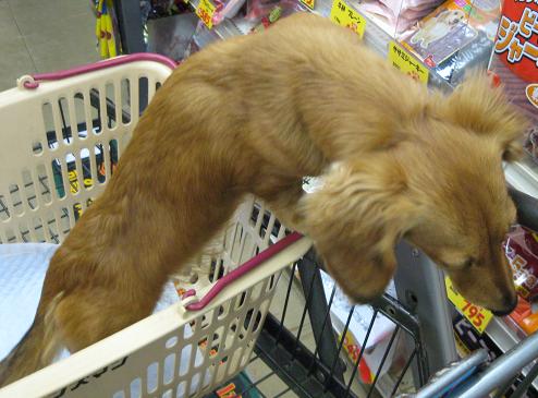 このかごは一般の商品用買い物かごとは色が違う、ペット専用かご。