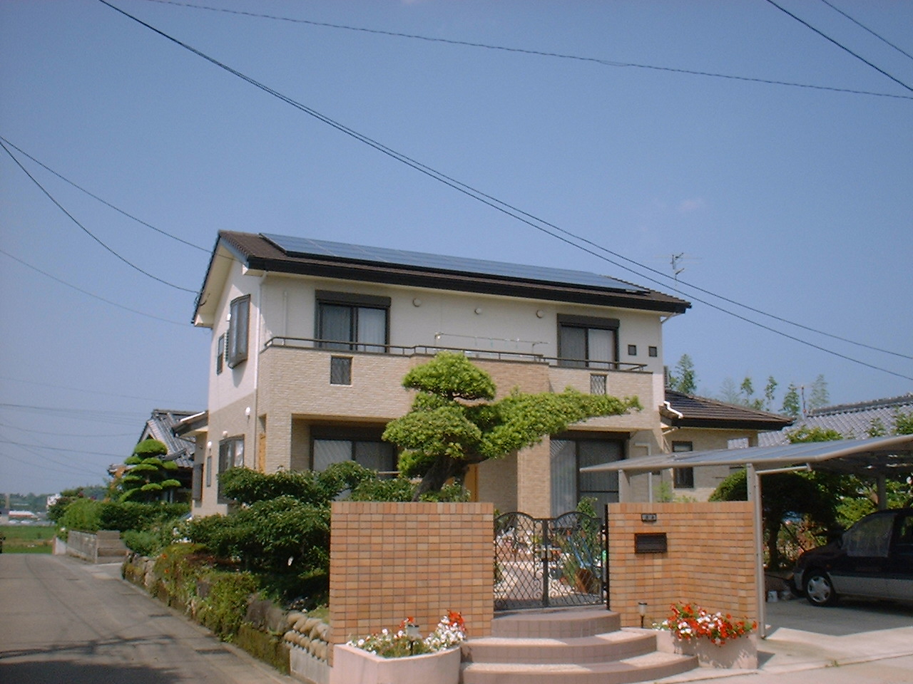 屋根にはソーラーパネルが設置されています。太陽光発電システム採用の住宅です。