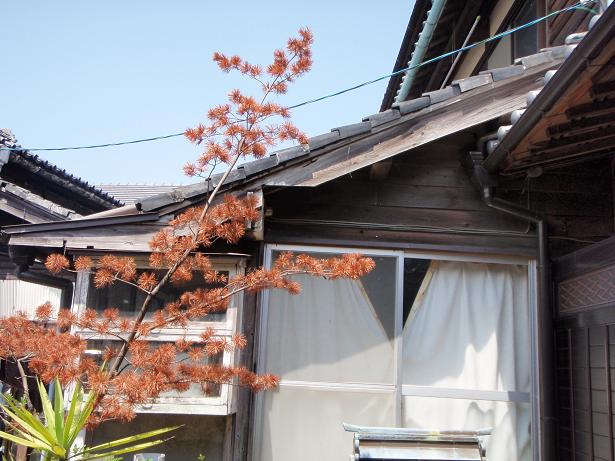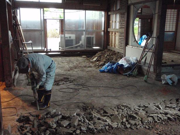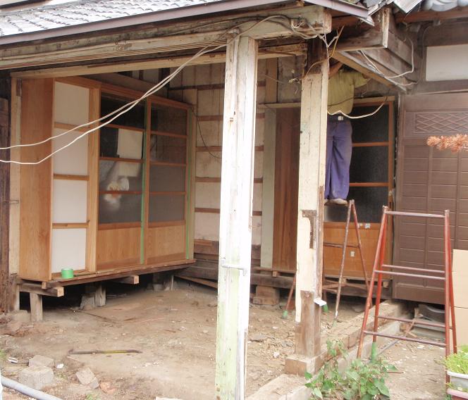奥では設備工事が進行中です。古い和風住宅の欠点のひとつが、コンセントの少ないこと。リフォームに当たってはその解消は大事なことです。
